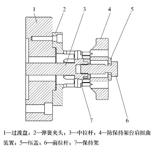 改進后的夾具工作原理為:中拉桿連接到機床活塞桿上,中拉桿左右移動,其錐面使彈簧夾頭脹大、縮小,實現銅保持架的夾緊、松開;同時中拉桿帶動前拉桿、壓蓋和防保持架臺肩扭曲裝置左右移動,實現保持架臺肩的緊固和松開。